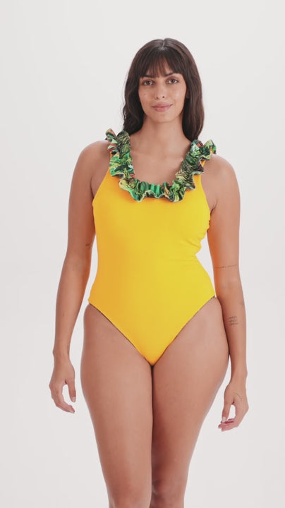 The Carmen Tropical Sunshine One-Piece is a stunning, Colombian-inspired swimsuit designed to celebrate your unique shape and story. Featuring a vibrant tropical leaf print, this one-piece is accented with delicate ruched detailing and a contrasting sun-yellow interior, radiating warmth and positivity. The open-back design and modest coverage strike the perfect balance between elegance and comfort, making it a versatile addition to your swimwear collection. Made with a high-quality 4-way stretch polyester spandex fabric, this piece moves with you for a flawless fit every time. Whether lounging poolside or chasing the waves, the Carmen One-Piece is your go-to for effortless style and confidence.